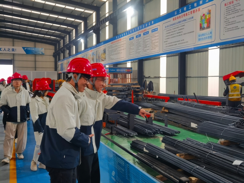 师生调研首站抵达淮安枢纽。建管局、建设处相关同志系统介绍了二期工程的总体规划与建设进展。在实地参观地涵施工及钢筋加工智慧云工厂期间,同学们对大体积混凝土浇筑、自动化控制设备表现出浓厚兴趣,不时提问交流。随后,大家移步智慧中心,工程师结合实例讲解焊接机器人、无人机识别施工进度等前沿技术在二期工程中的应用,引发同学们的深入思考。